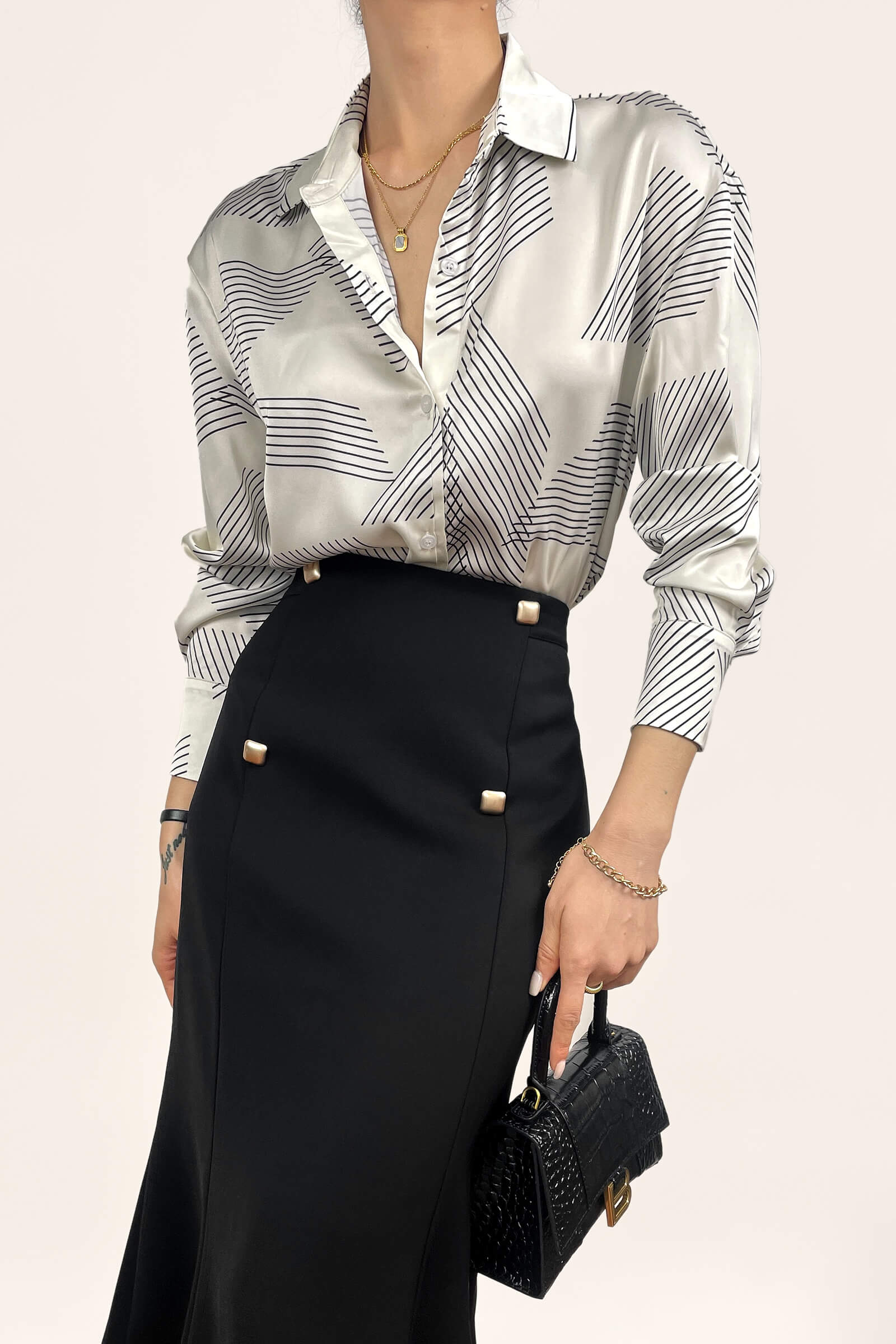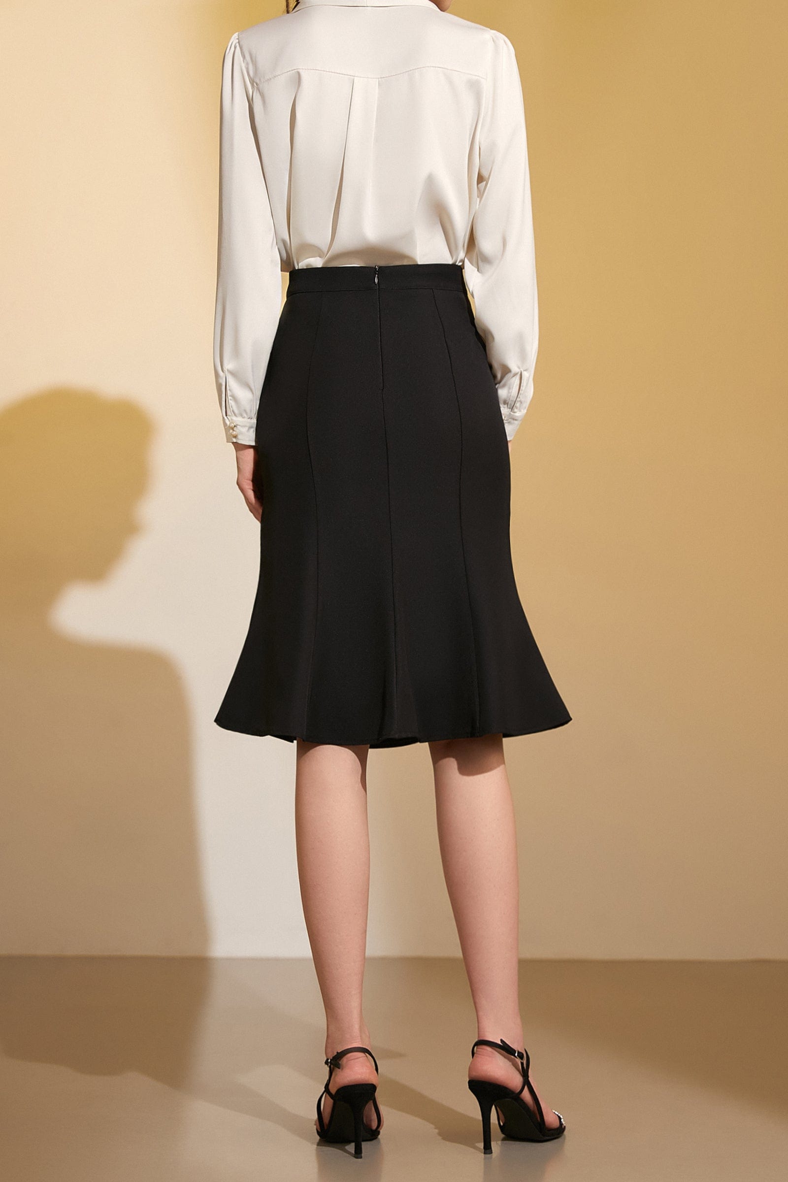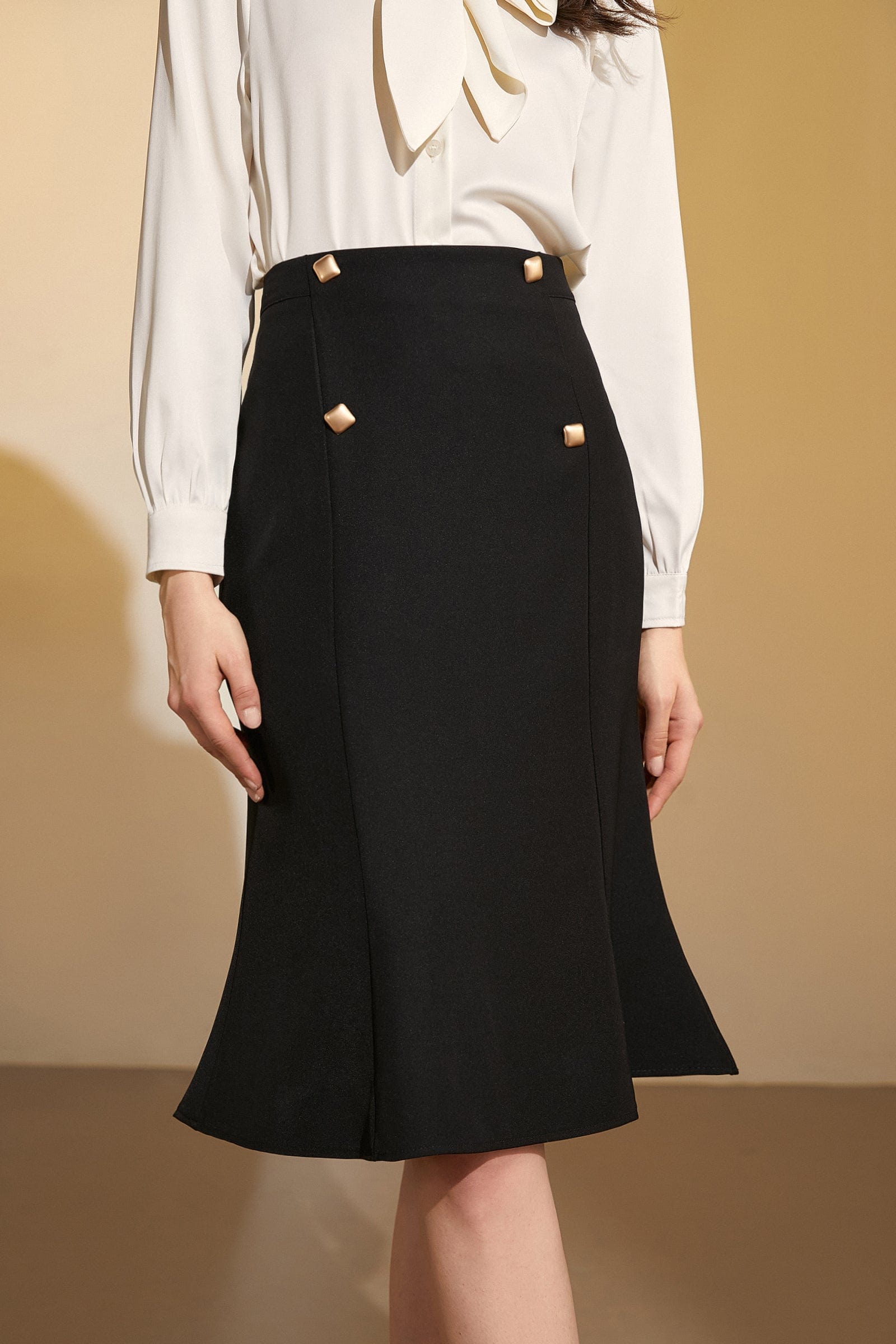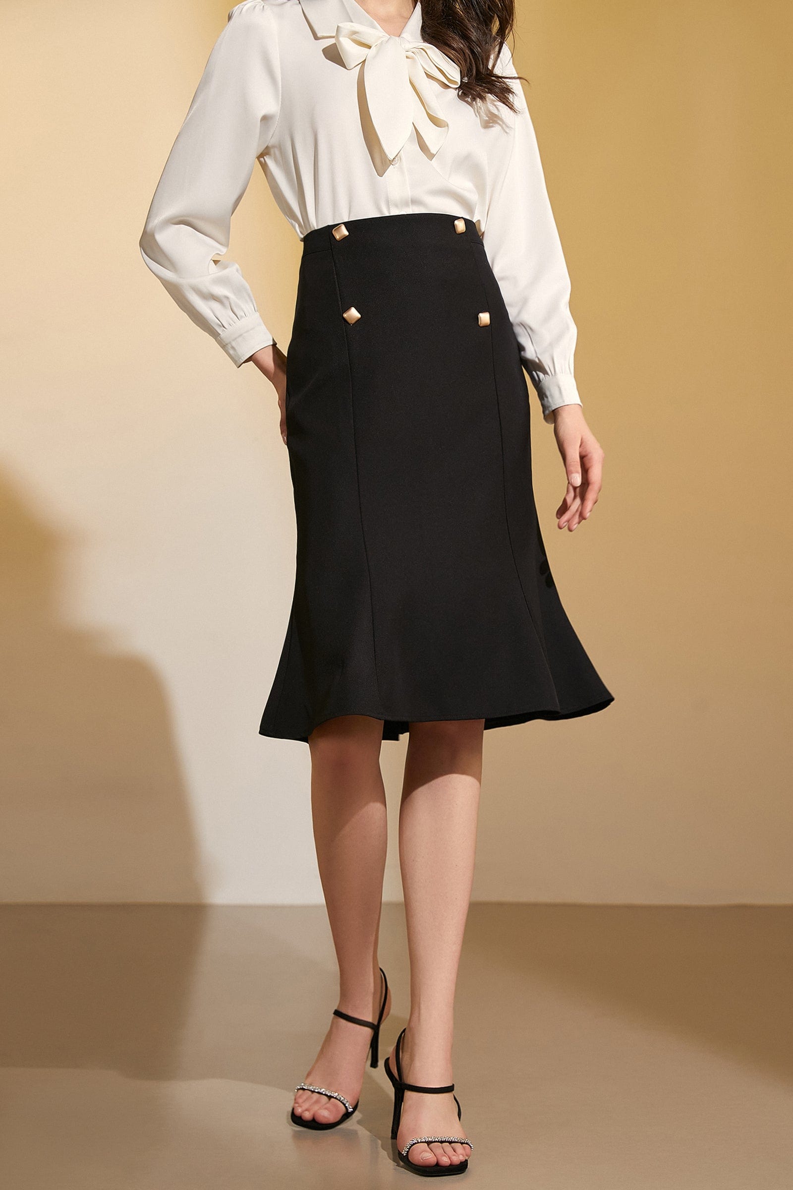 This chic midi skirt is detailed with a ruffled hem, decorative buttons, and hidden back zipper. A simple and stylish piece for office wear.