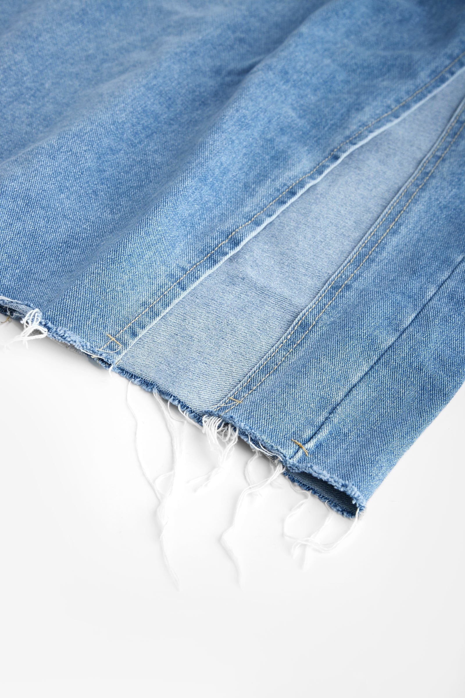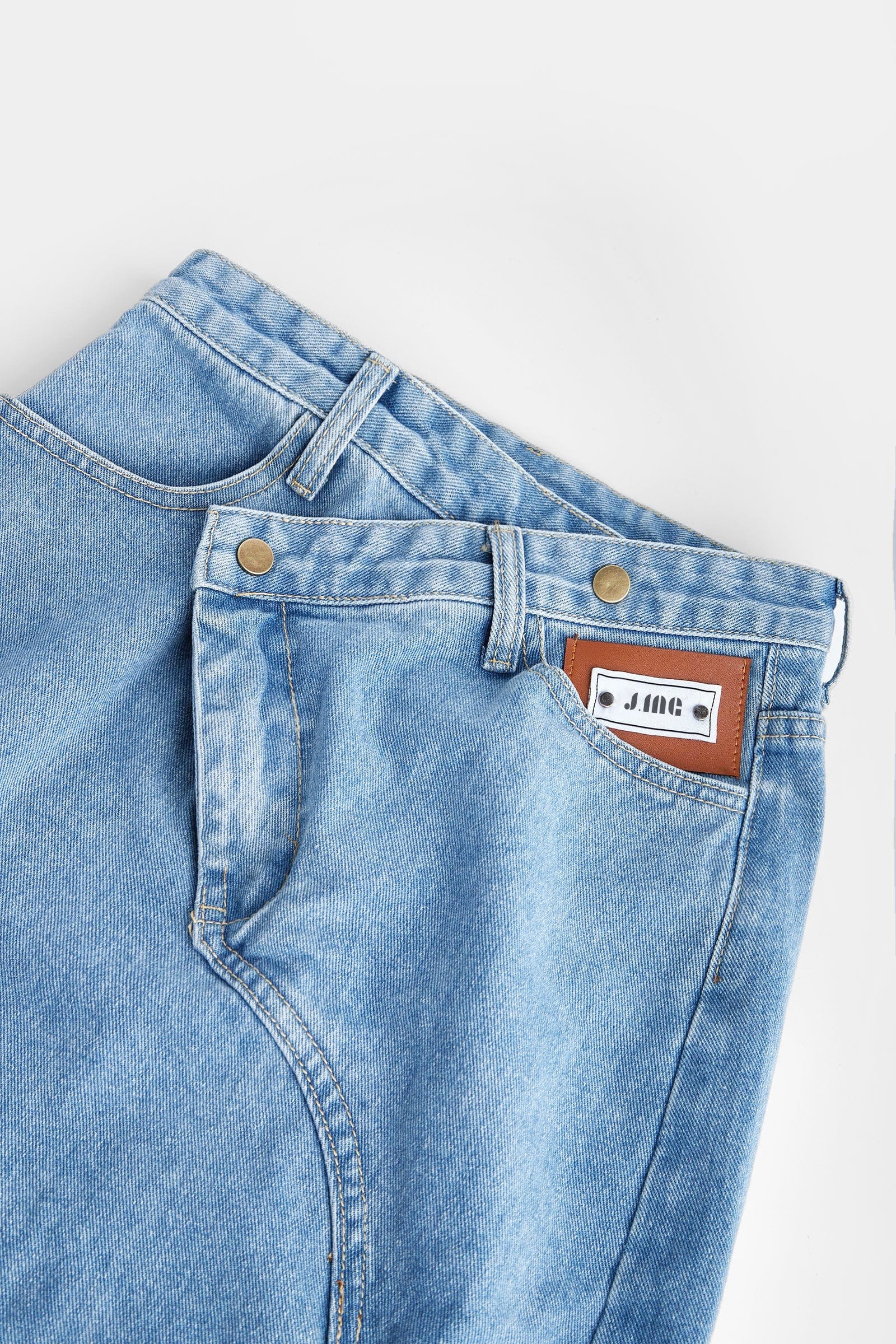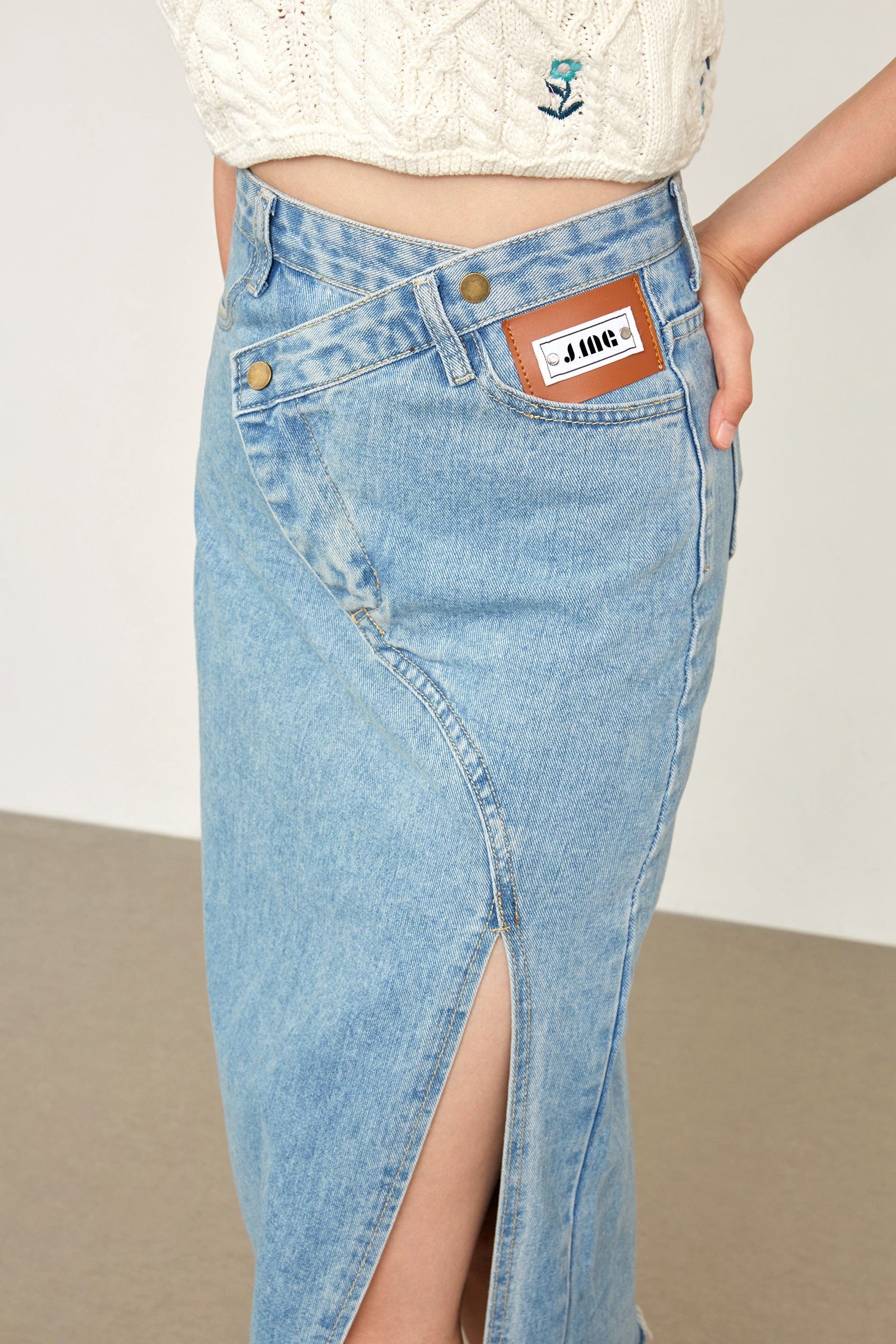 This denim midi skirt has a unique asymmetrical flair. Features a high waistline and a slit hem. Pair with sneakers and shirt for your both lazy and active days. Made of smooth cotton, viscose and polyester.